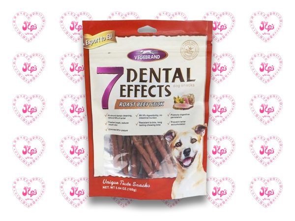 تشویقی دنتال سگ وجی برند با طعم گوشت گاو برشته (Vegebrand 7 Dental Effects Dog Snack Roast Beef Flavor)، دارای هفت خاصیت مفید برای بهبود سلامت لثه و دندانهای سگ میباشد. این محصول موجب تمیز شدن دندانها شده و ۹۹ درصد از تارتارهای سخت دندانی را از بین میبرد. این تشویقی دنتال دارای شکلی لولهای و پیچیده است که زمان جویدن سگ را افزایش میدهد. همچنین آسان هضم است و باعث نفخ و سنگینی سگ نمیشود. تشویقی وجی برند با استفاده از مواد طبیعی تولید شده و فاقد هرگونه مواد افزودنی مصنوعی و نگهدارنده میباشد. علاوه بر این موجب تقویت عملکرد سیستم گوارشی شده و بوی بد بدن پت را کاهش میدهد.